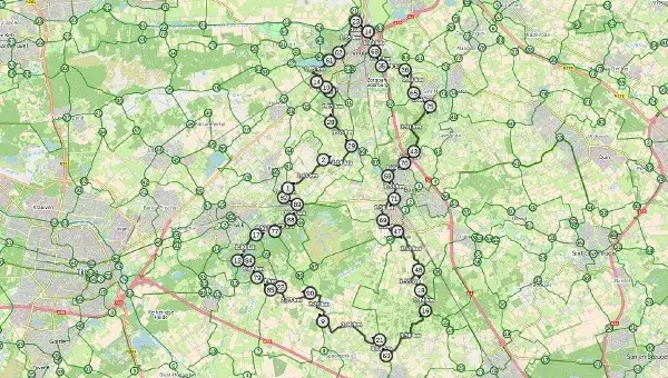 Diese Route beginnt am Hotel. Beim Verlassen des Parkplatzes biegen Sie links ab. Vorbei an der Kreuzung Taalstraat / Paardensteeg befinden Sie sich am Knotenpunkt 14 und die Route beginnt.