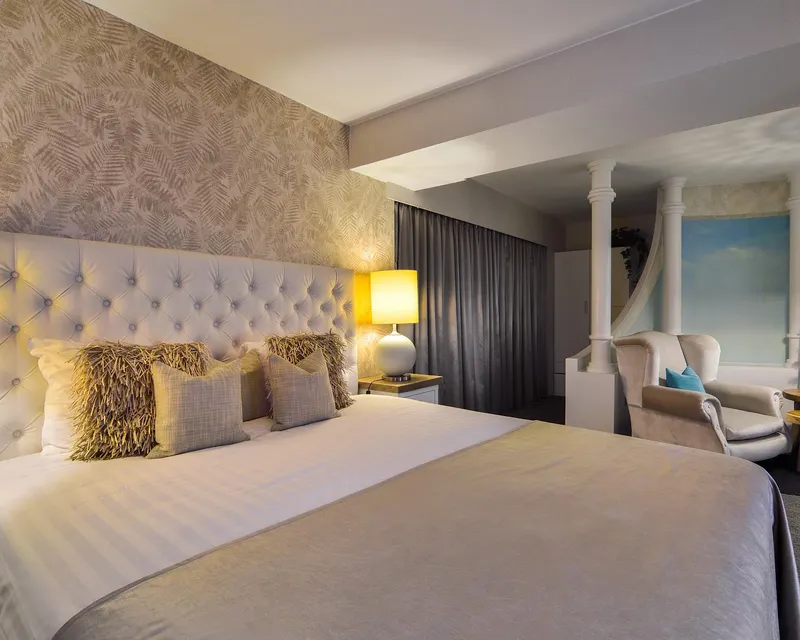 Lassen Sie sich von der einzigartigen Delphi-Suite mit ihrem griechischen Flair verzaubern. In dieser großzügigen 69 m² großen Suite schlafen Sie auf einem komfortablen Kingsize-Boxspringbett. Die Suite bietet Ihnen eine private Terrasse mit Sitzgelegenheit, eine Klimaanlage sowie eine gemütliche Sitzecke mit Kamin und Flachbildfernseher. Ein Safe sowie Möglichkeiten zur Zubereitung von köstlichem Kaffee und Tee runden das Angebot ab. Ein besonderes Highlight ist das luxuriöse, offene Badezimmer: Hier erwartet Sie eine großzügige Rundbadewanne unter einem funkelnden Sternenhimmel sowie eine separate, begehbare Dusche. Dank ihres einzigartigen Designs und der luxuriösen Ausstattung eignet sich die Delphi-Suite hervorragend als Hochzeitssuite und verspricht unvergessliche Momente.